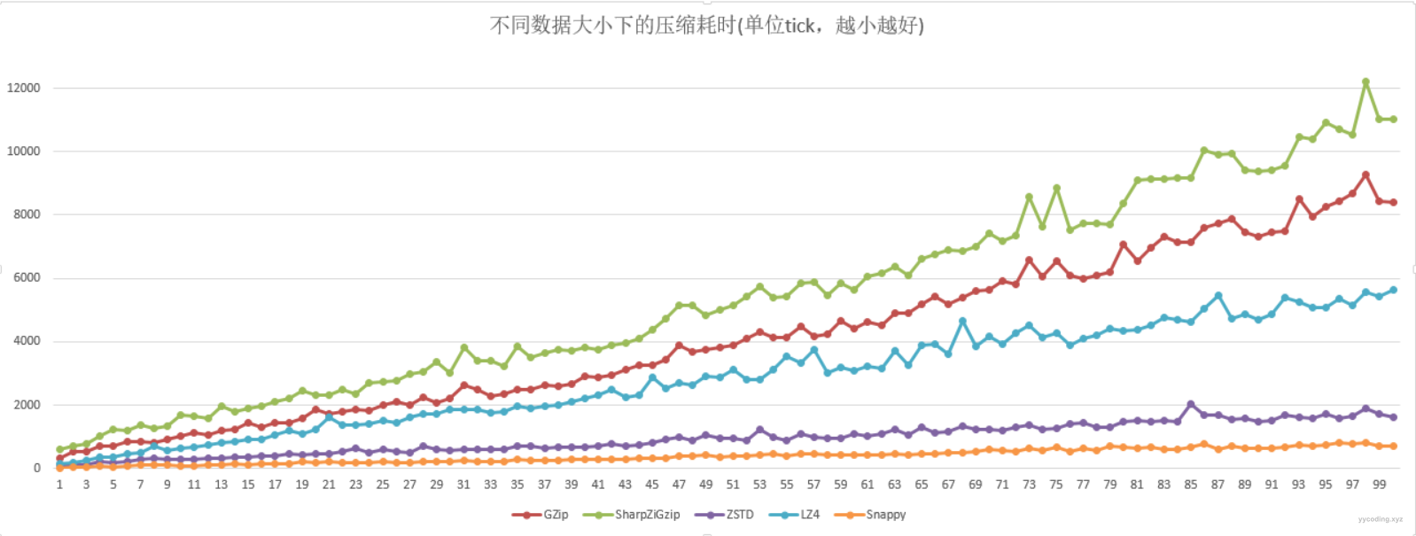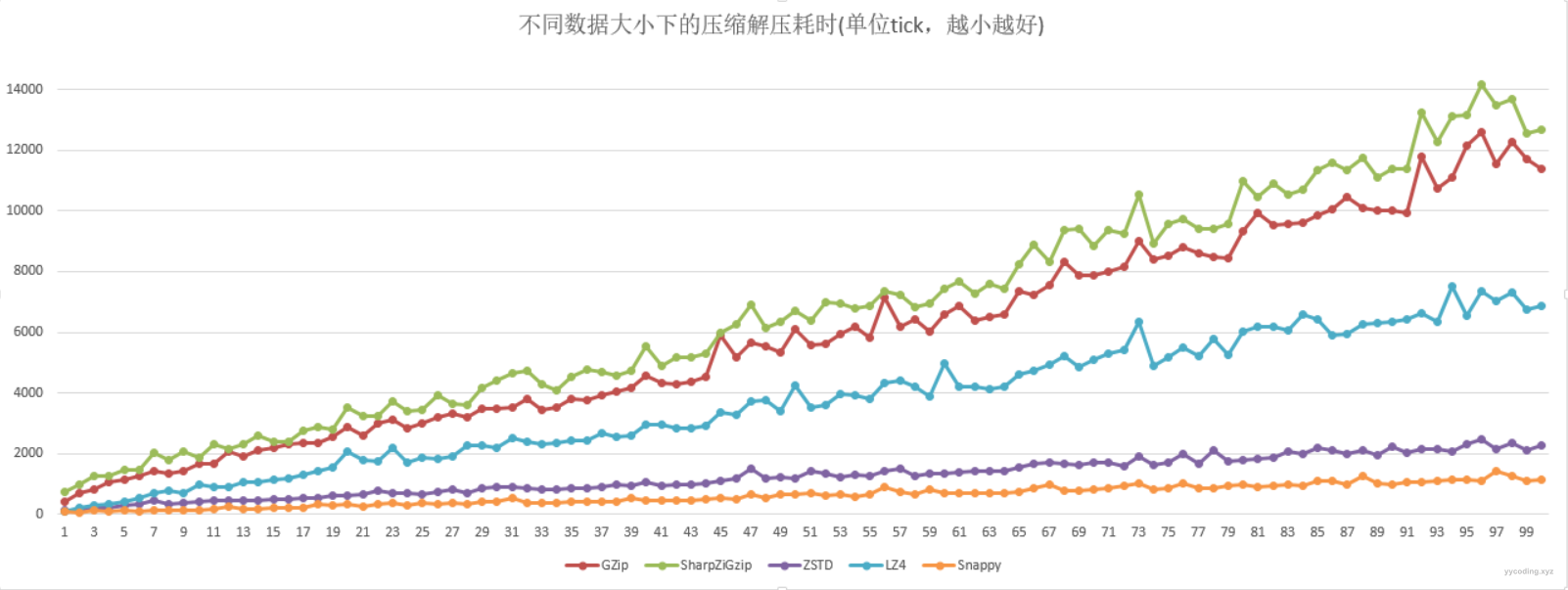 在压缩和解压总耗时方面,整体跟单独的压缩耗时差不多。依然是Snappy最优,Zstd也相当优秀,两个GZip的实现比较耗时,且SharpZipLib比内置的更耗时。