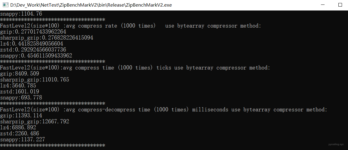 需要说明的是,本文只是针对特定的平台:NET Framework 4.5、特定的测试数据:股票的极速Level2数据来进行不同压缩算法的相对效率比较。并且没有使用BenchmarkDotNet这种专业的性能分析工具来对比分析,其原因是限于.NET Framework 4.5平台的限制,BenchmarkDotNet最新的版本并不支持.NET Framework 4.5,如果使用4.5版本,则缺少一些特性,比如我需要的除了运行时间之外,还需要压缩率这种指标,在BenchmarkDotNet支持4.5的版本里还没找到如何实现。一个标准的测试,需要考虑线程优先级,垃圾回收对结果的影响,这些因素我没有考虑,但是这样的影响对所有的算法则都一样,且我是测试了1000次求平均得出的结果,所以应该是具有参考意义的。另外在Github上,EasyCompressor这个项目使用BenmarkDotNet比较了.NET Core平台下各种压缩效率,它得出的结论也是Zstd最好,有兴趣的可以看看。