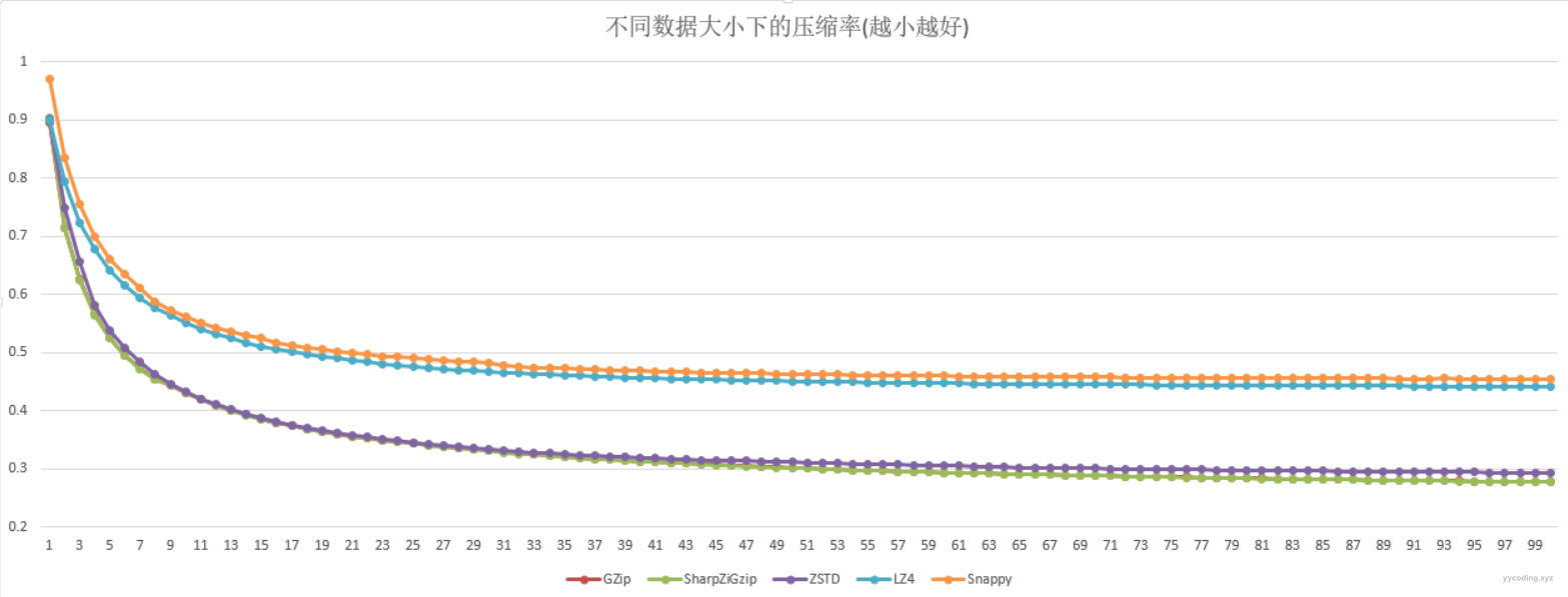 可以看到在压缩率方面,GZip和SharpZipGzip以及Zstd是在一组,LZ4和Snappy在一组,总体而言,前者比后者压缩率要好很多。C#内置的GZip实现、与SharpZip的实现,两者在压缩率方面比较接近,基本差不多。当Size变大时,GZip和SharpZip整体压缩率率比Zstd稍好,大概在9~10倍的FastLevel2大小时,两者比较接近。