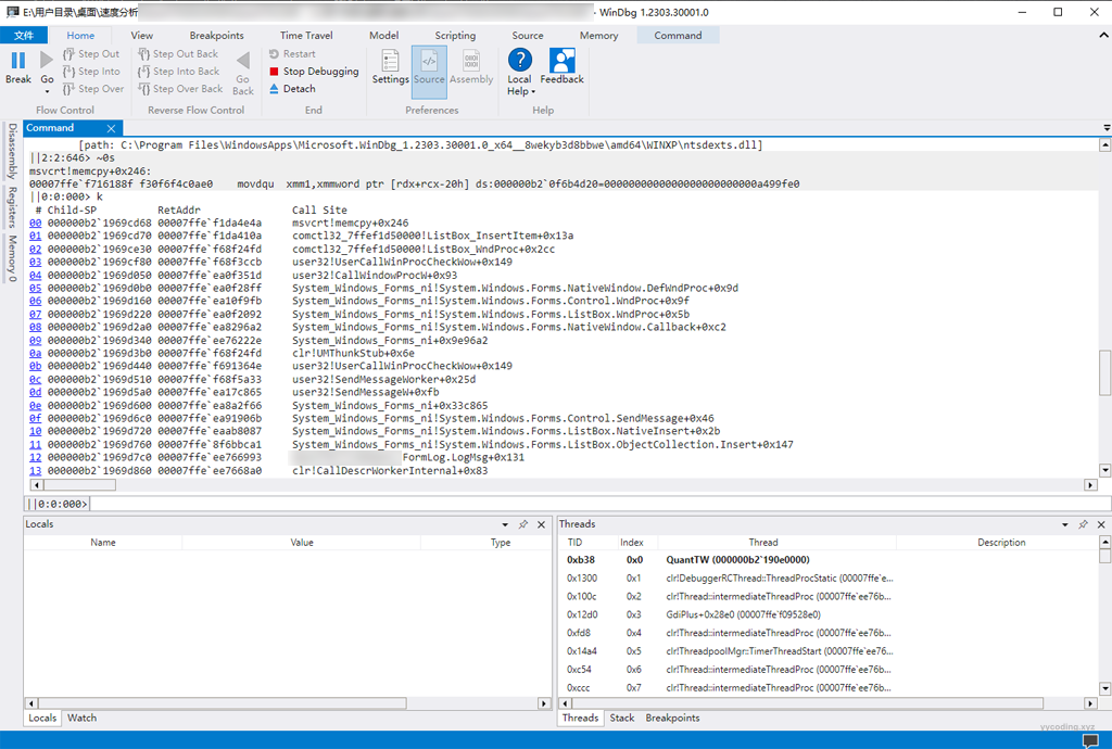 我其实在家里的笔记本上很早就体验过了,这里为了写这篇文章假装初体验一下,比如我最近开发的一个小程序在开发过程中发现运行时间长了界面卡死,但CPU和内存占用不是很高,那么原因在哪里呢?直接把进程dump出来,在Windbg里打开,切换到0号UI线程,然后输入k看下当前的线程堆栈在干啥。