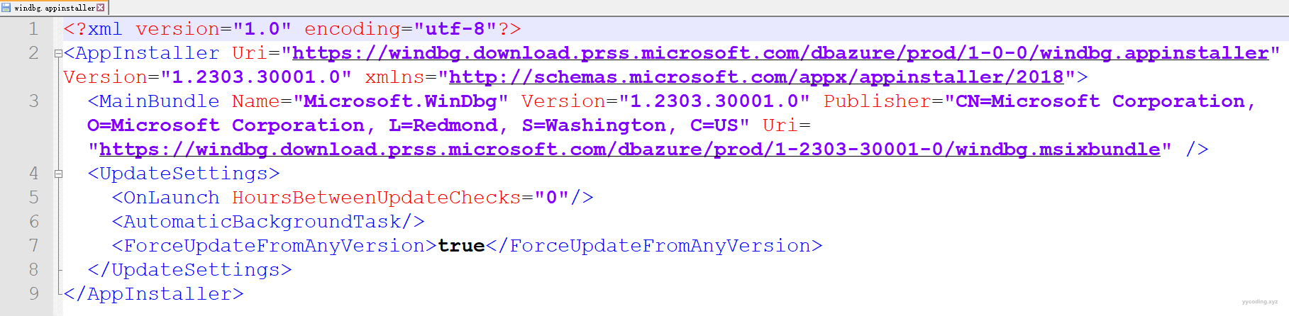 上面下载的这个名为“windbg.appinstall”的1Kb在线安装包,它其实是一个描述文件,用记事本可以直接打开。打开后发现就是一个xml文件。