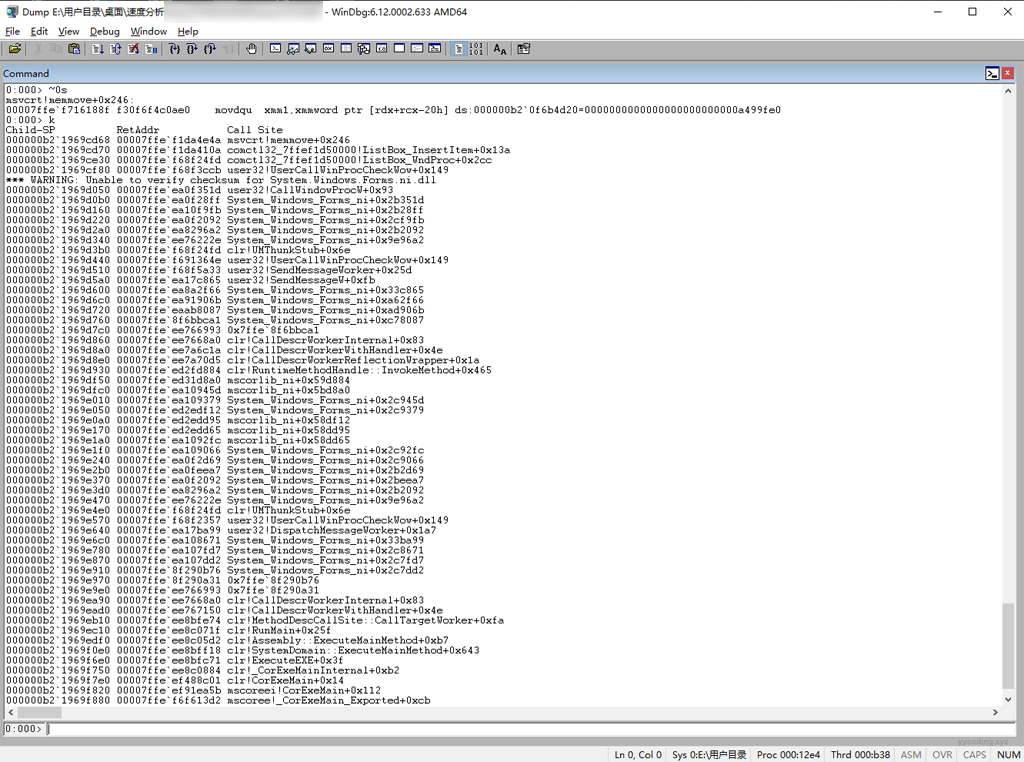 当然使用旧版的WinDbg也可以,但奇怪的是,有些地方显示不出来,但仍然能看出一些问题的端倪。