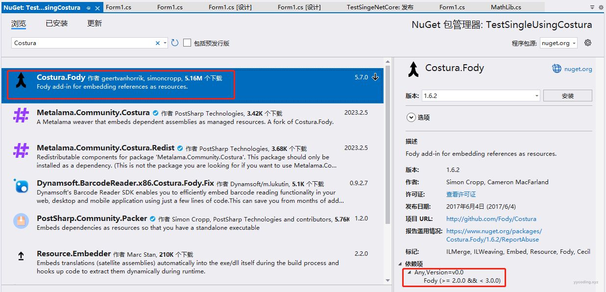 ▲因为项目是.NET Framework 4.5,所以支持的最新版本为Costura.Fody 1.6.2版本