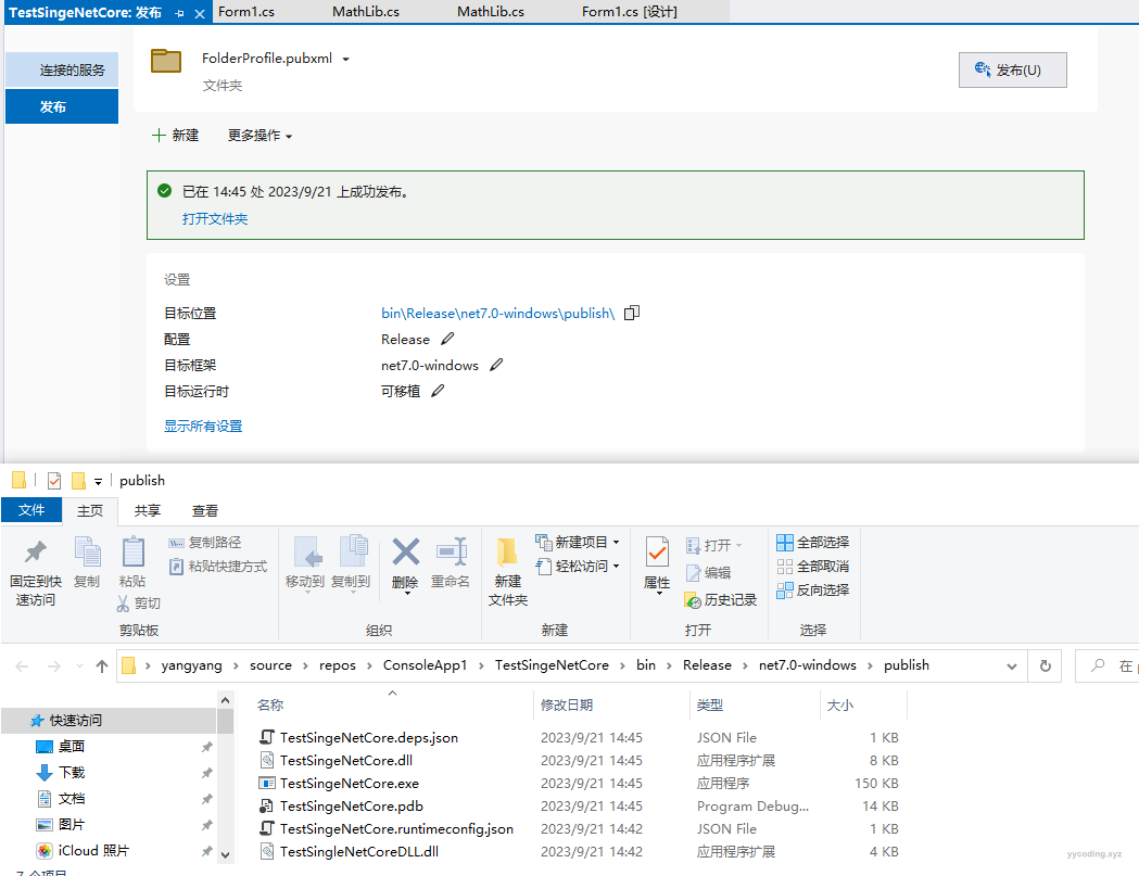 上面演示了在.NET Framework中如何通过将依赖的dll作为嵌入式资源添加到exe中从而达到编译为单一exe的效果。在.NET Core中则不需要这么麻烦了,在发布中就能直接生成单一应用,我这里没有.NET Core 3.0的环境,这里以.NET Core 7.0为例,在Visual Studio 2022中创建了两个项目,一个为TestSingleNetCore的Winform应用,一个为TestSingleNetCoreDLL的类库,在Winform中直接引用TestSingleNetCoreDLL项目或者生成的dll,