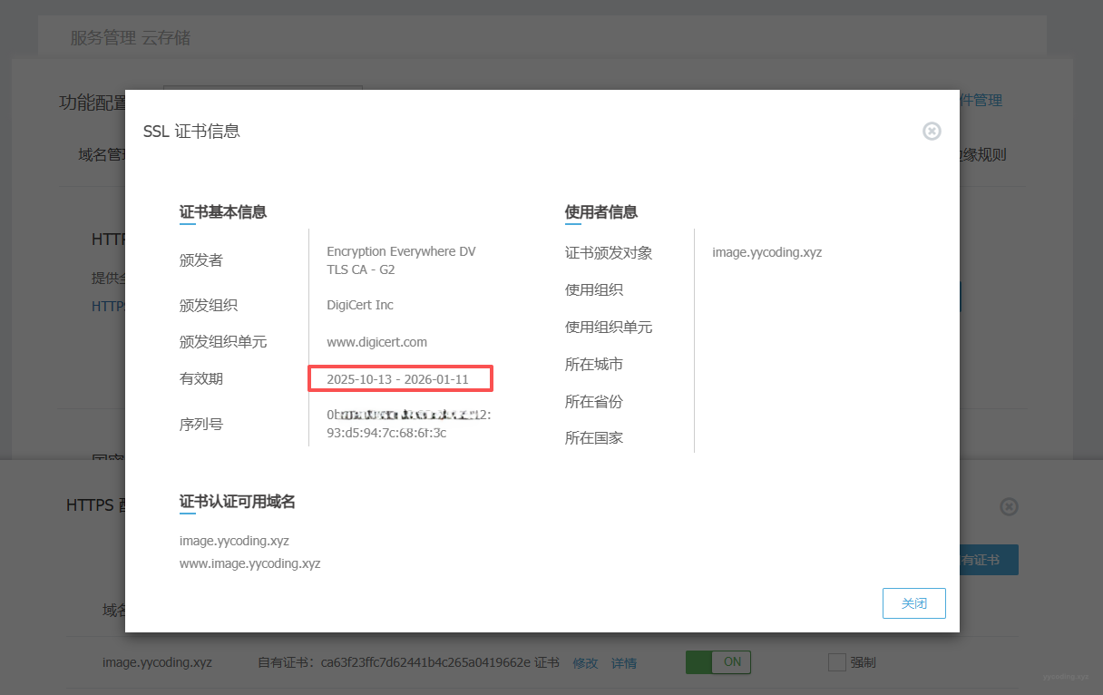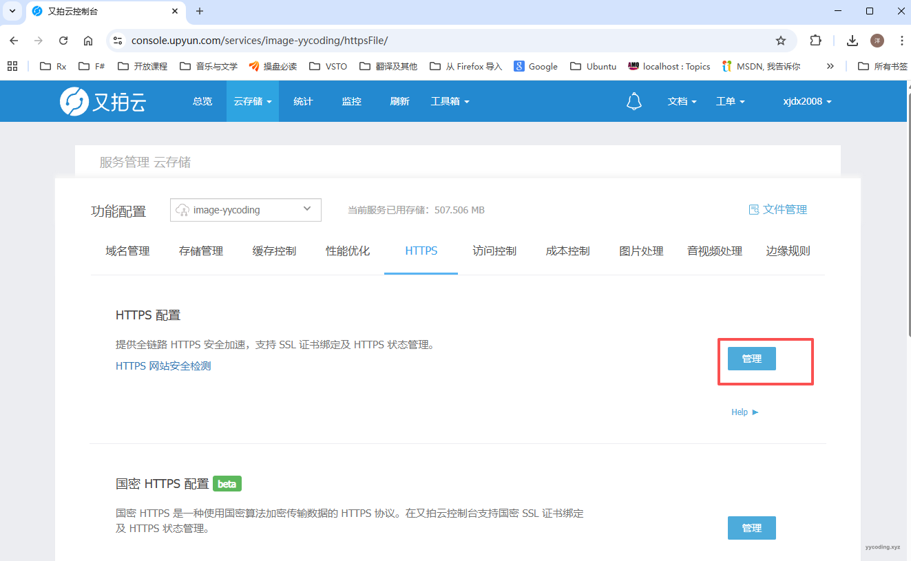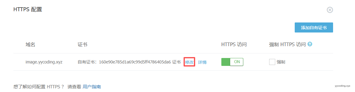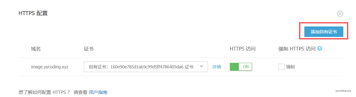 网站图片托管在又拍云上,域名是image.yycoding.xyz,所以需要去又拍云上,添加域名证书。