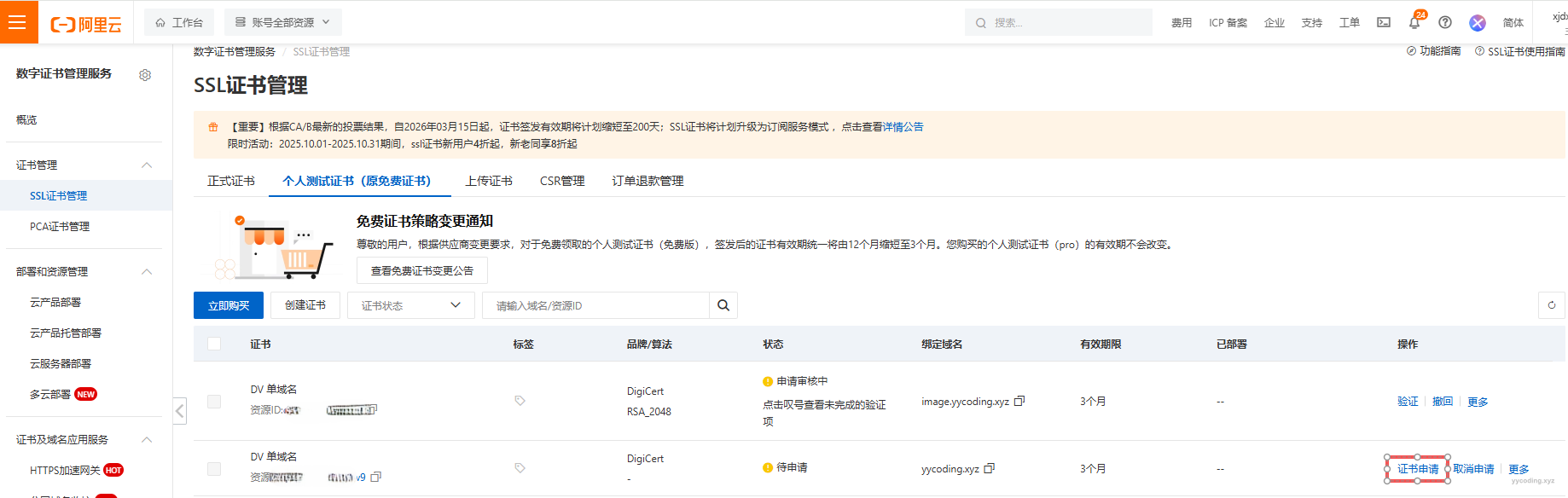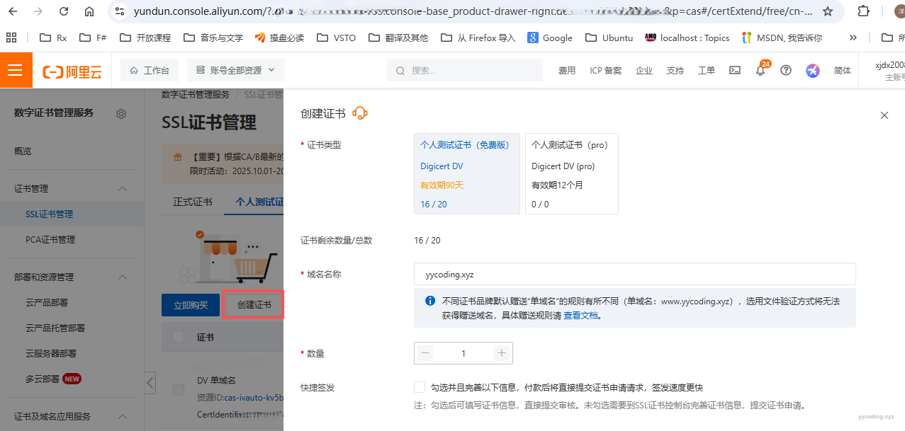 Step2:在创建证书界面,选择个人测试证书,这里要填写域名名称,域名名称就是省略前面“www.”之后的全部内容。我需要申请两个域名,一个是主站用的“yycoding.xyz”,一个是又拍云用的“image.yycoding.xyz”。所以这里需要创建两个证书,这里仅演示其中一个。