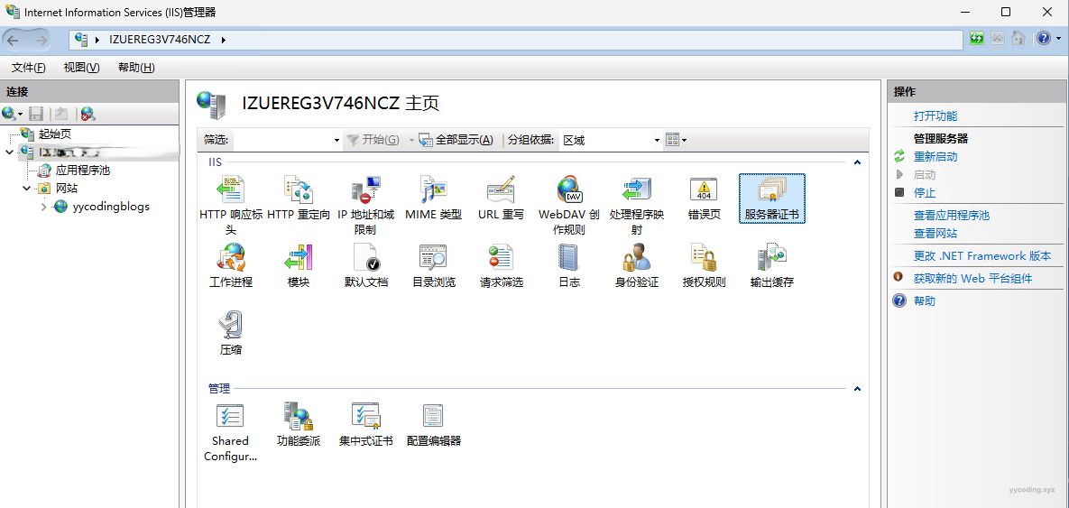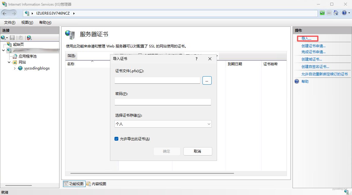 Step3:打开IIS,在服务器证书中,点击”导入“,在弹出的对话框中,选择上述pfx文件,以及填写.txt里面的密码,可以先删除旧有的证书。