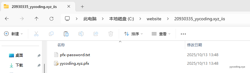 Step2:IIS格式证书下载完成之后解压,里面有两个文件文件,以txt结尾的是证书密码;以pfx结尾的是证书。