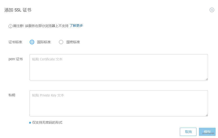 Step3:在”HTTPS配置“中点击”添加自有证书“,弹出的界面如下图,需要填写”pem证书“和”私钥“。