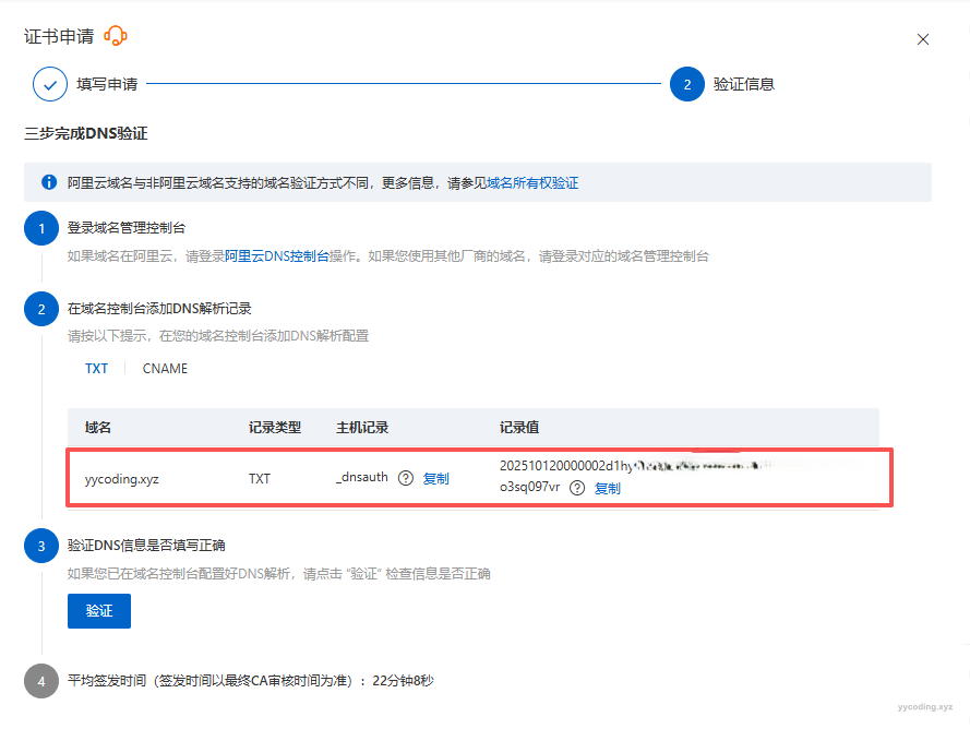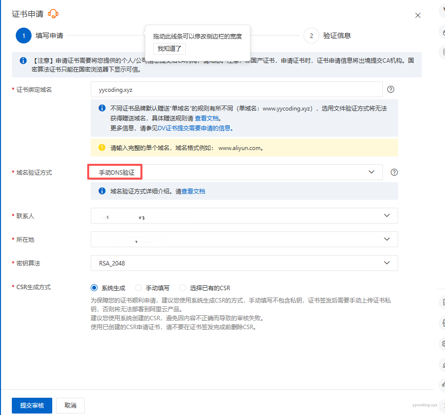 △ “域名验证方式”这里选择的是手动DNS验证,这需要拥有域名的控制权,可以在域名下面添加新的DNS解析用于验证。