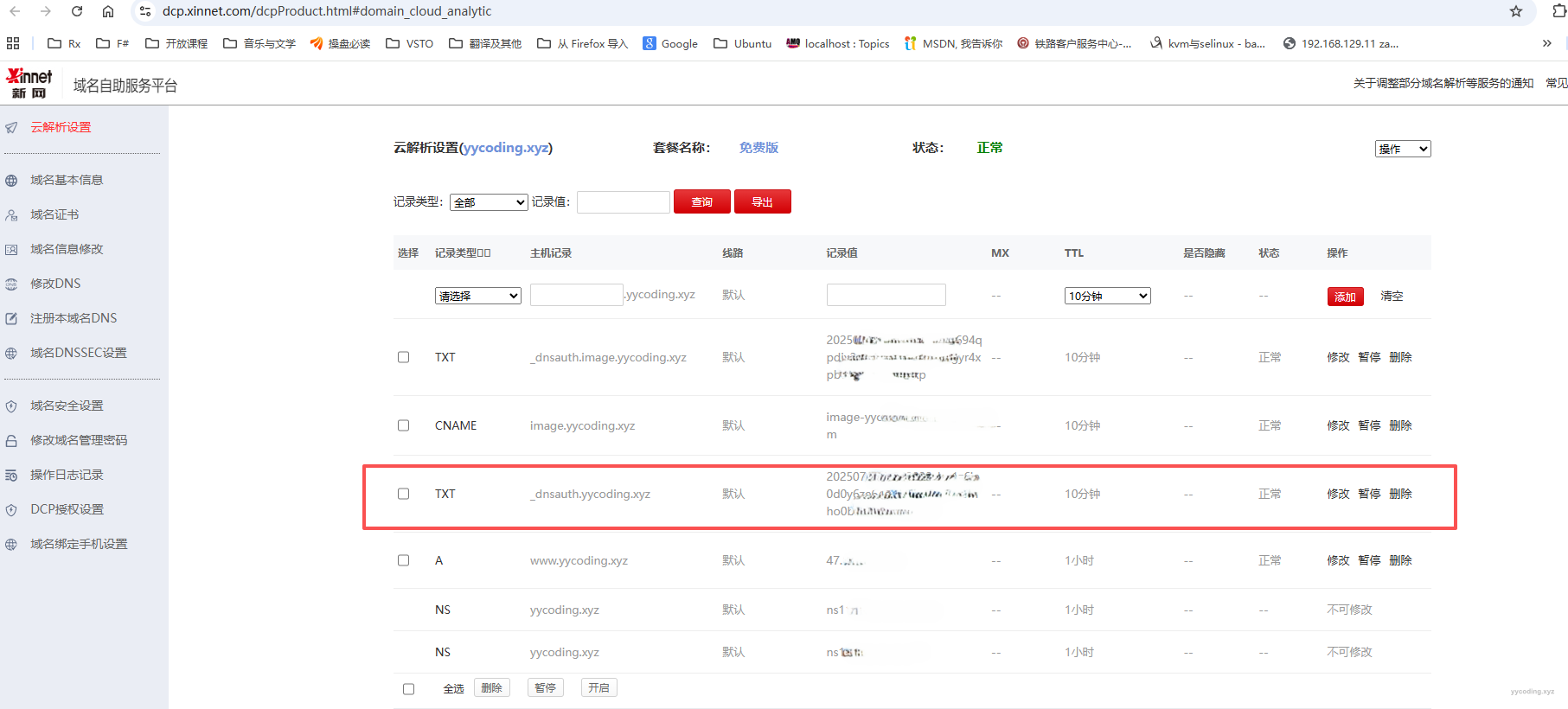 Step5:登录到域名管理页面,在”云解析设置“里面,添加或者修改解析记录。这里按照上面的要求来添加一条解析:记录类型是"TXT",主机记录是"_dnsauth",记录值是上述图片里的记录值。