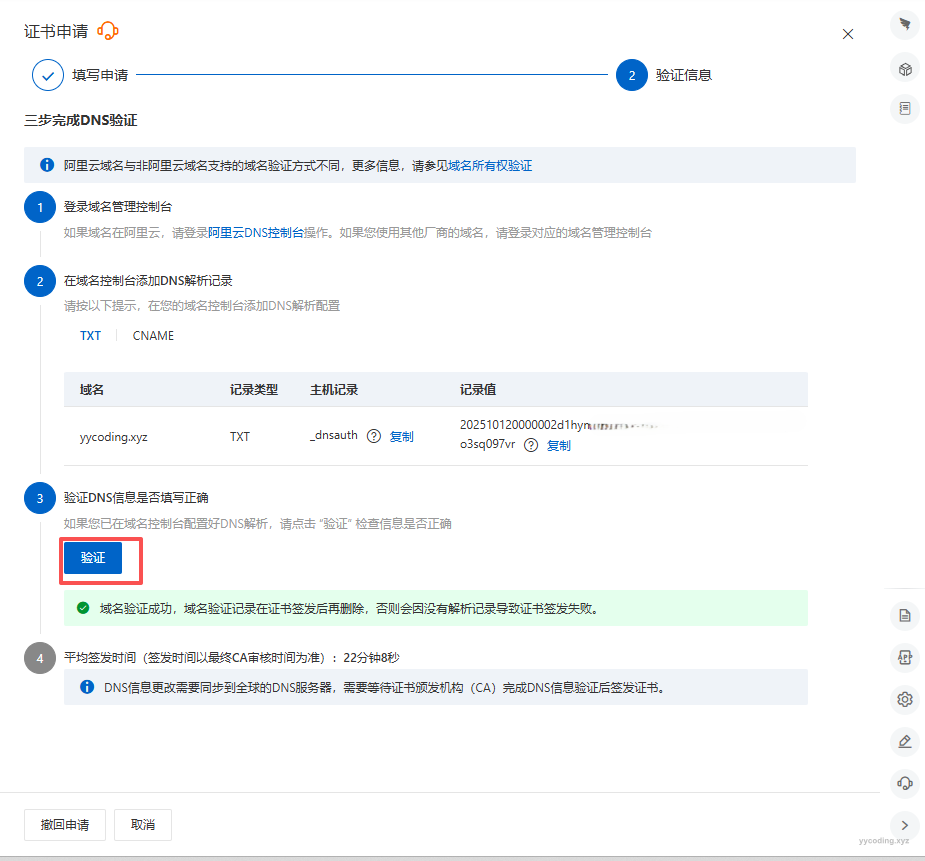 Step6:在域名解析下填好对应的DNS验证解析之后,就可以点击验证按钮,如果不行,可能要稍等片刻等待域名解析那边设置的值生效才可以。