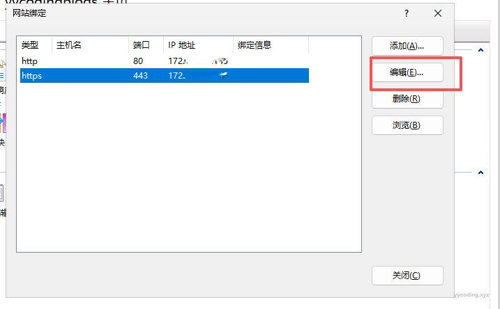Step5:在弹出的对话框中,添加或编辑https选项,在编辑网站绑定的对话框中,选择先前导入的证书。