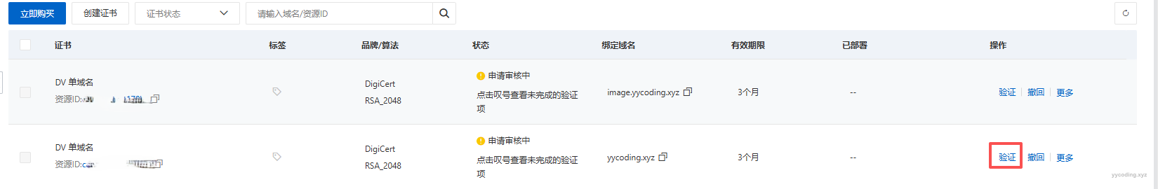 Step3:创建完成之后状态为"待申请“,需要点击“证书申请”按钮。在证书申请界面上,需要核对“证书绑定域名”,和“域名验证方式”。
