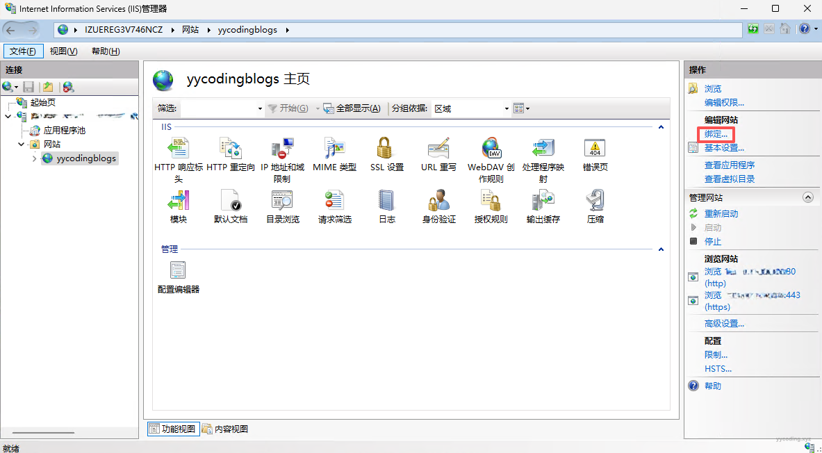 Step4:证书导入完成之后,紧接着去绑定站点。在IIS中,选中网站,然后点击右侧的绑定。
