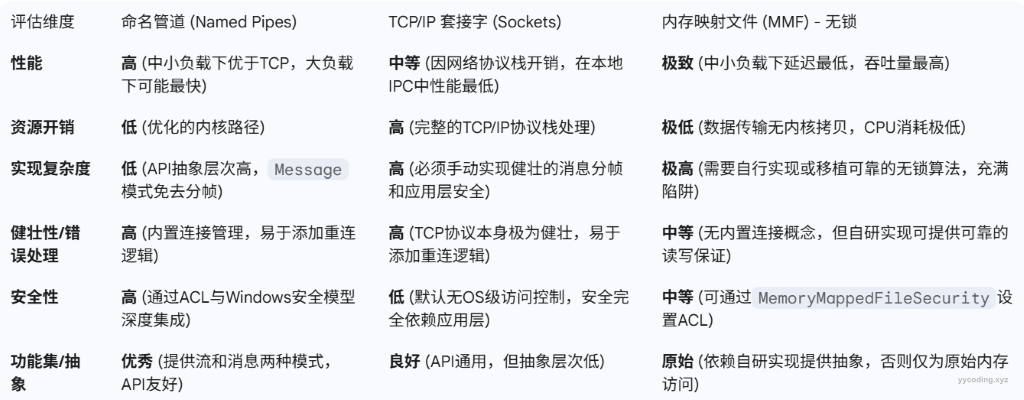 - MMF 是低延迟、高频、中小负载场景下的性能之王。对于大块数据的持续流式传输,命名管道可能凭借其高效的内核拷贝机制提供更强的吞吐量。TCP 因其协议栈开销,在所有本地场景下都是最慢的。