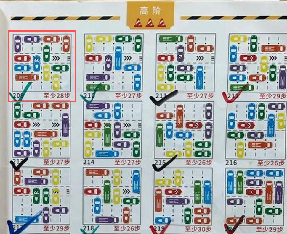 游戏提供了初级、中级和高级共200多道关卡设置的地图,每个关卡只标识最少移动步数(可能有误)。按照地图布局摆放车辆,然后通过各种移动来实现车辆出库。游戏关卡的特点如下:
