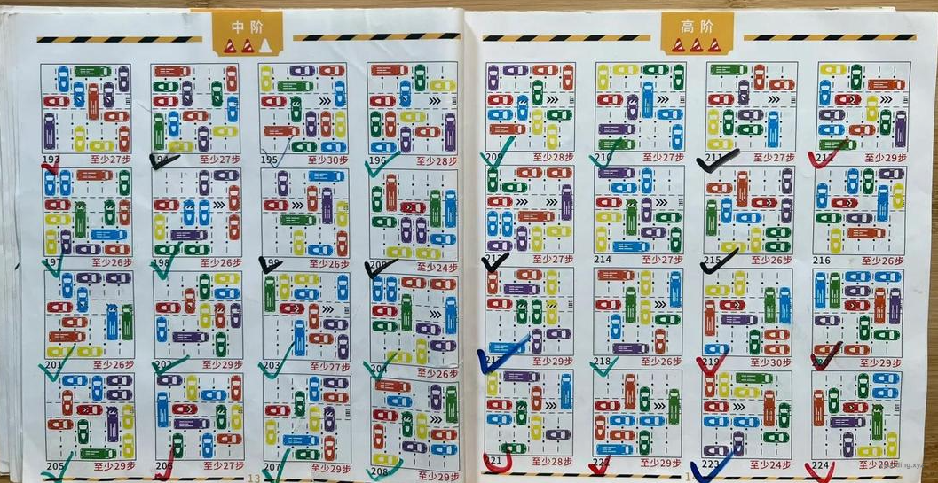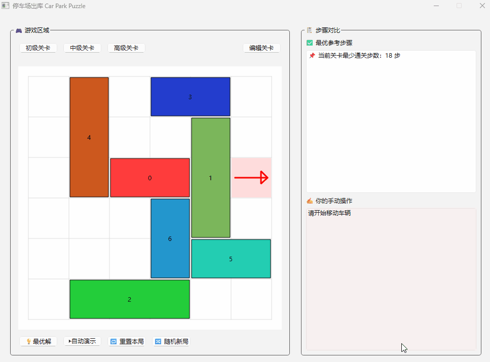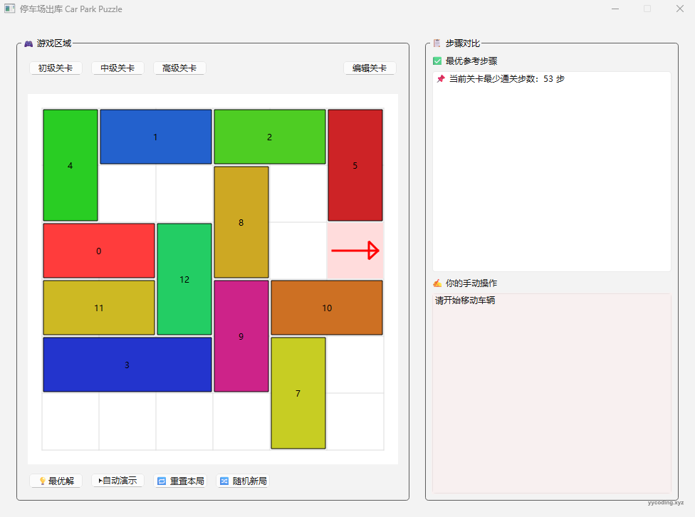 之前在家跟孩子玩过一个叫《停车场出库,Car Park Puzzle》的益智小游戏,核心玩法借鉴了经典的华容道(滑块拼图)机制。游戏规则简单易懂,游戏关卡分为初级、中级和高级。初级较简单,中级、高级关卡则比较复杂。中高级关卡对于四五岁的小孩挫败感较强,即使对于成年人也很有挑战,游戏没有提供正确解法,人工试错效率低,也容易陷入死胡同。基于以上难点,我在思考能否用算法来解决这个问题。